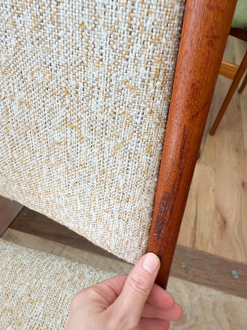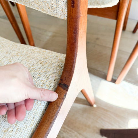 Set of 6 mid century modern danish teak dining chairs by R Huber & Co. New foam and light yellow/beige tweed upholstery. Some scuffing, scratching, areas of discoloration from age appropriate wear.