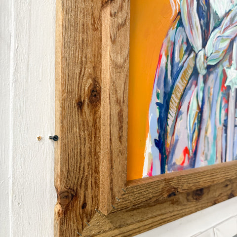 A vibrant, expressive portrait painted by local artist Krystal Sokolis of Ophilya Handmade, featuring bold color, texture, and character. Framed in a rustic natural-wood frame, this statement piece brings personality and warmth to any space.
