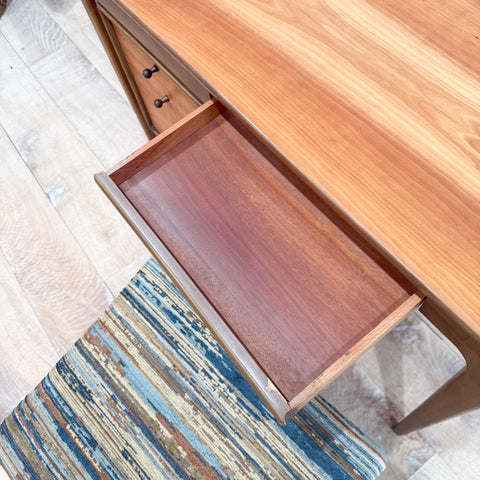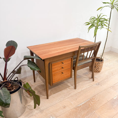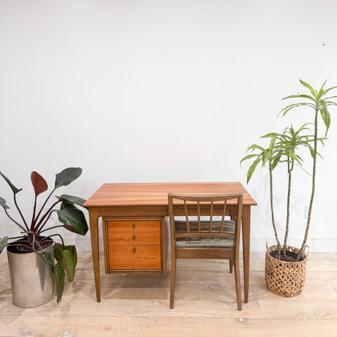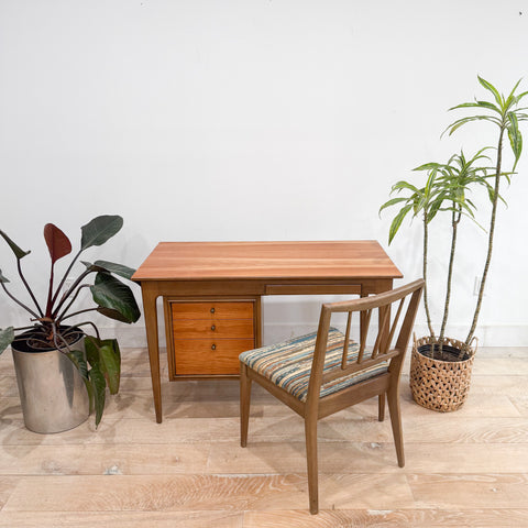 Beautiful vintage desk and matching chair by Century Furniture. Features clean mid-century lines, 4 drawers for storage with bronze colored pulls. The chair includes a newly upholstered seat with a sculptural back design. A perfect compact setup for a home office or workspace.