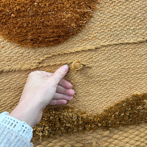Striking vintage woven wall hanging featuring a warm, tonal landscape design with a rising sun and sculptural woven textures. The natural fibers and fringe detailing add beautiful depth and an organic, mid-century feel to any space.