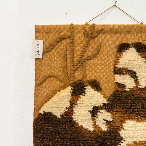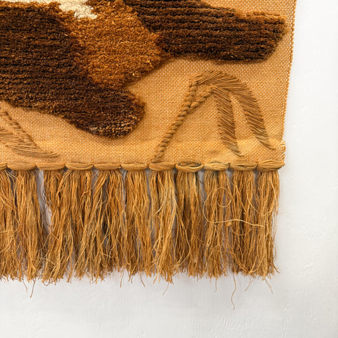 Charming vintage textile wall hanging featuring a pair of abstract pandas in rich brown and cream tones with dimensional tufted texture and natural fringe detail. Adds warmth, personality, and a playful vintage touch to any space.