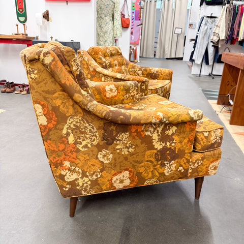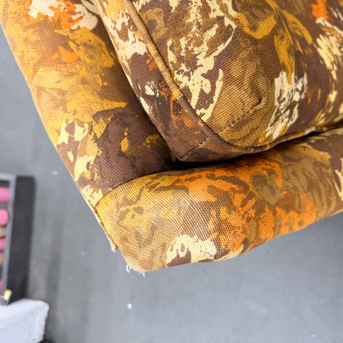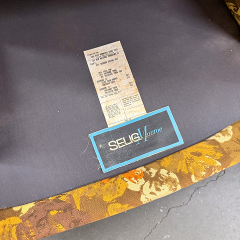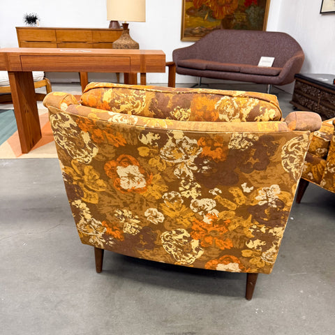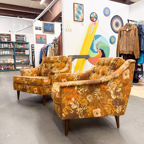 Pair of mid century modern "his and hers" floral lounge chairs by Selig. The original fabric is in good condition overall with a few areas of wear (see photos - slight discoloration - small hole on back). Found in Midmix Furnishings space at atomic.