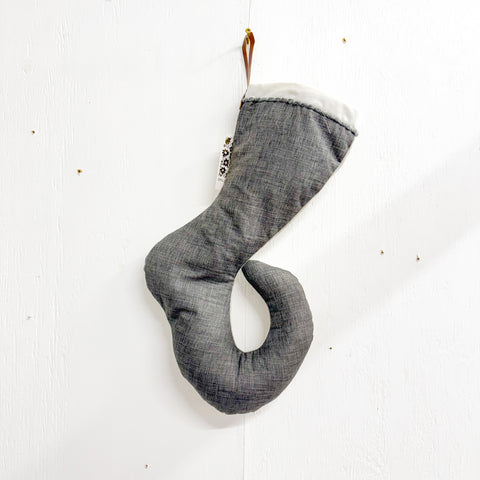 Handcrafted by Ophilya Handmade, this sculptural stocking design features a unique curved toe, soft linen texture, and a hand-stitched cuff detail with a leather hanging loop. Its neutral tones make it perfect for modern or rustic holiday decor.