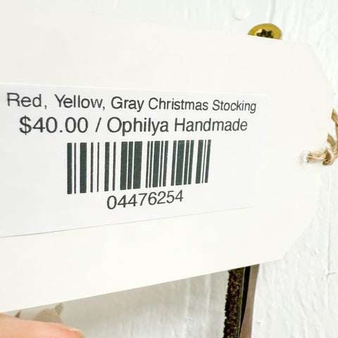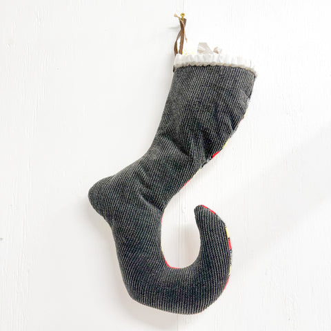 Beautifully handmade stocking created using a woven red, yellow, and gray patterned textile on the front, paired with a charcoal woven fabric on the back. Finished with a soft white ruffle trim at the opening and a leather hanging loop.