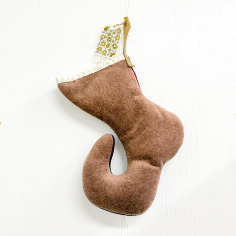 A sweet small-size stocking made from a burgundy plaid textile with a brown fabric backing. Finished with a ruffled top edge, hand-stitched details, and a leather hanging loop. Beautifully handcrafted in Asheville by Ophilya Handmade.