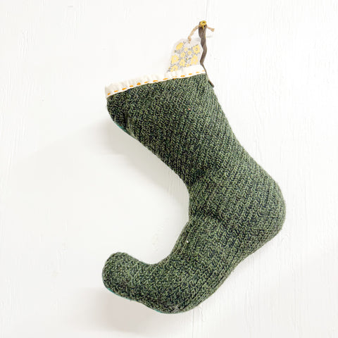 Beautifully handcrafted stocking made from a mix of vintage-inspired fabrics, finished with quilt-style detailing and a soft coordinating backing. Includes a stitched top edge and a leather hanging loop.