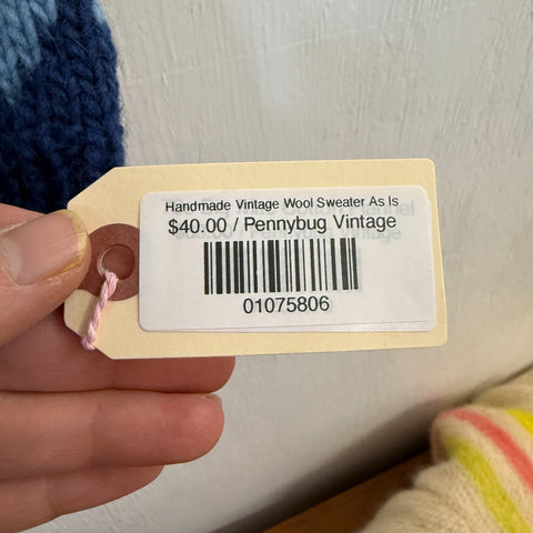 A cozy, hand-knit vintage wool sweater featuring a traditional Fair Isle design in navy and light blue tones on a natural heathered base. The heavier wool knit makes it ideal for cool-weather layering while maintaining that classic, handmade charm.