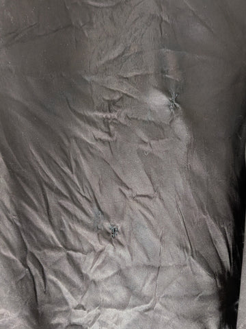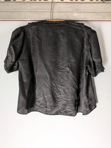 Black satin bed jacket with snaps added so that it can be worn as a blouse. Some tiny mends to pinholes here and there. Fits a nice range of sizes, from xs to petite large.