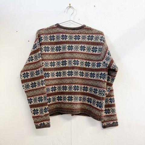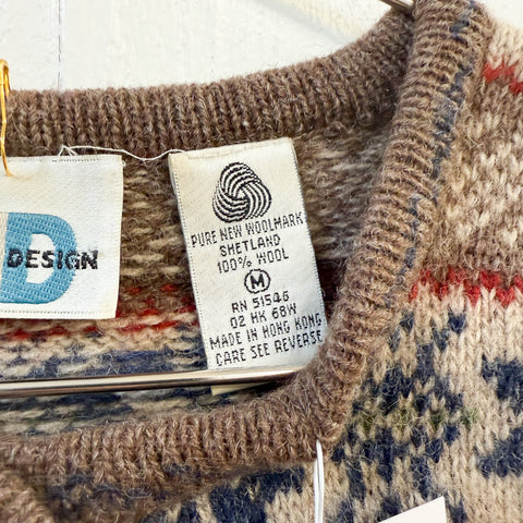 A classic Shetland wool cardigan featuring a traditional Fair Isle snowflake pattern in warm shades of brown, cream, navy, and red. Crafted from 100% pure new wool, this mid-weight knit offers timeless winter style and cozy comfort. Designed by Paul Harris Design and made in Hong Kong, it’s a beautiful example of 1980s–1990s craftsmanship.