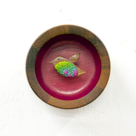 A vibrant embroidered hummingbird perched inside a vintage turned-wood bowl, hand-painted in a rich fuchsia tone.