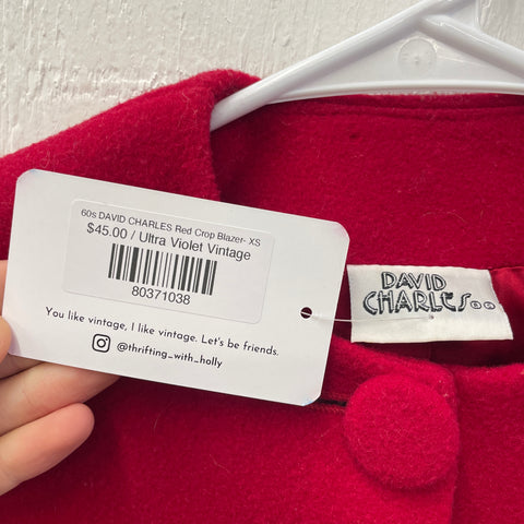 Make a bold seasonal statement with this 1960s red cropped blazer, designed to bring warmth and confidence to your fall and winter wardrobe.