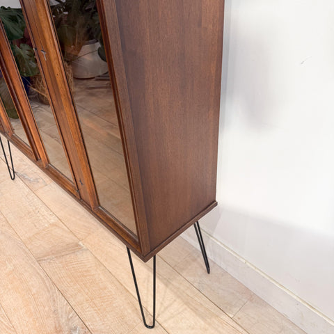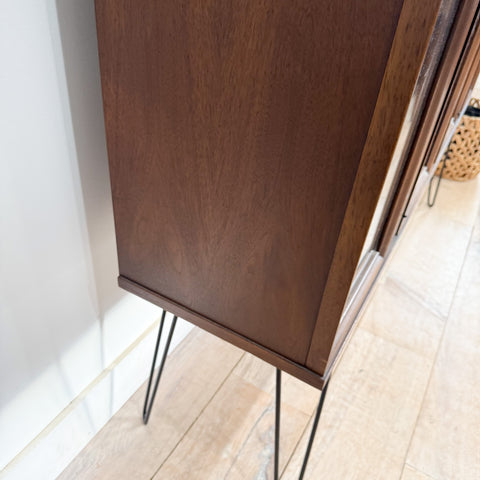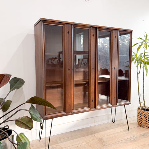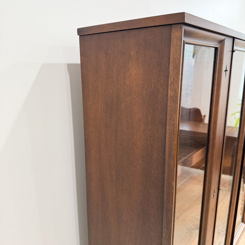 Mid-century walnut curio cabinet from the Broyhill Saga line featuring the collection’s iconic starburst motif and sleek black hairpin legs. The cabinet offers four glass-front panels (only the center two doors open) with stationary interior shelving—ideal for displaying glassware, collectibles, or books.