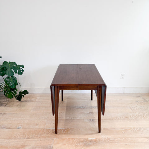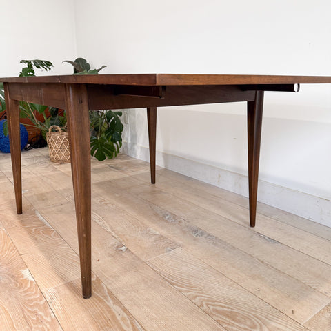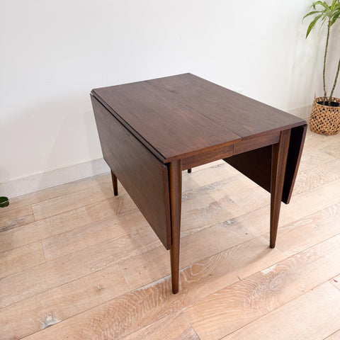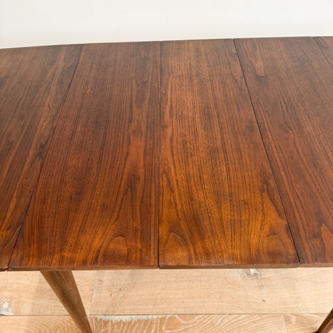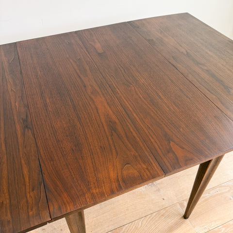 Mid-century walnut dining table by Broyhill from the Saga line. Features clean lines, tapered legs, and a drop-leaf design with one 12” leaf, allowing it to expand or fold down depending on your space and seating needs.
