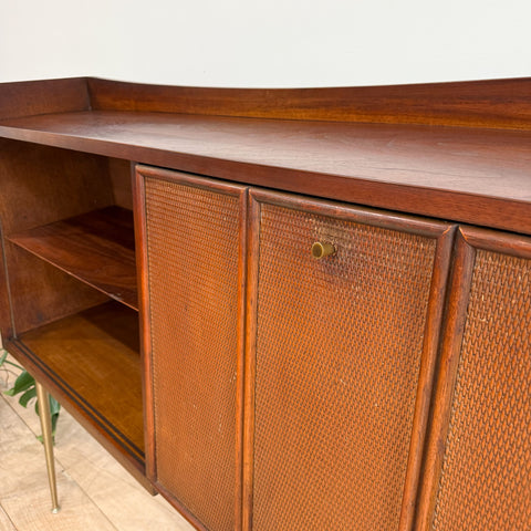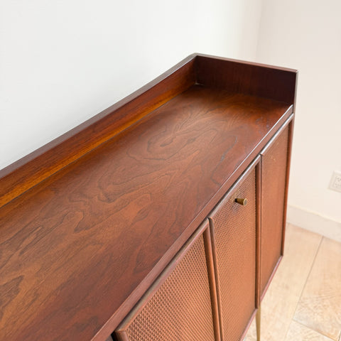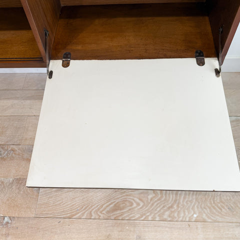 Mid century modern curio with drop down cabinet by the Broyhill Sculptra line. Some scuffing/scratching/small areas of veneer repair from age appropriate wear.