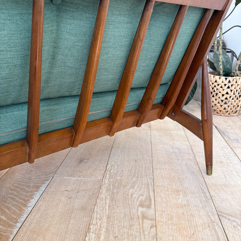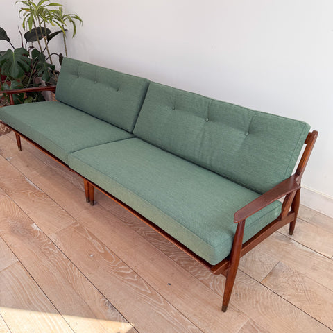 Mid century modern 2 part sofa with wooden frames. New deck pad, foam and green upholstery! Tufted back cushions. Some light scuffing/scratching/discoloration to the wooden frames from age appropriate wear. Can be arranged as one long sofa or separated by an end table!