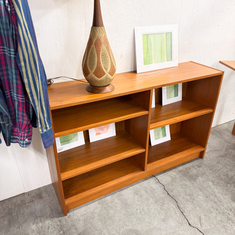 Vintage teak bookshelf. Some light scuffing/scratching/areas of veneer repair.